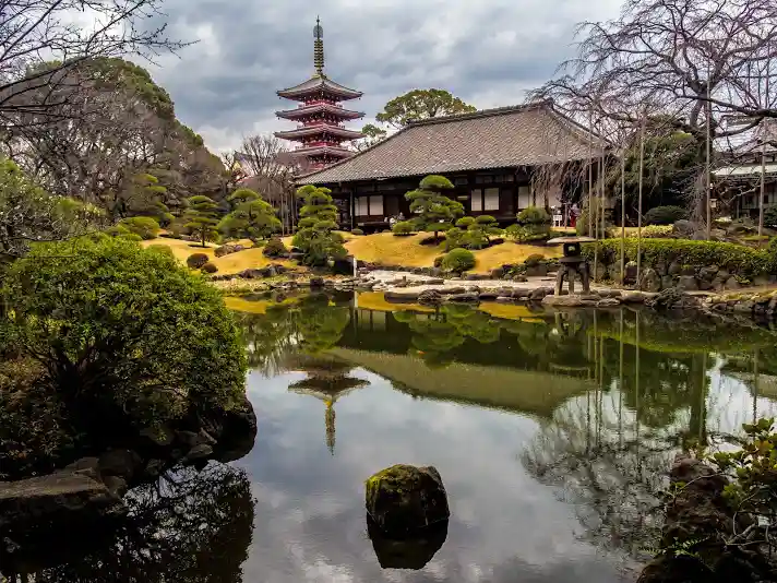 Demboin includes the Kyakuden (a building used to welcome guests), an entranceway, large and small Shoin (library and study rooms), and the Oima (living rooms) for the head priest of Senso-ji Temple. The Kyakuden was also used for memorial services and ascetic training. The Garden (closed to the public) has walking paths around a pond and is thought to have been built by Enshu Kobori in the early Edo Period (1603–1868).